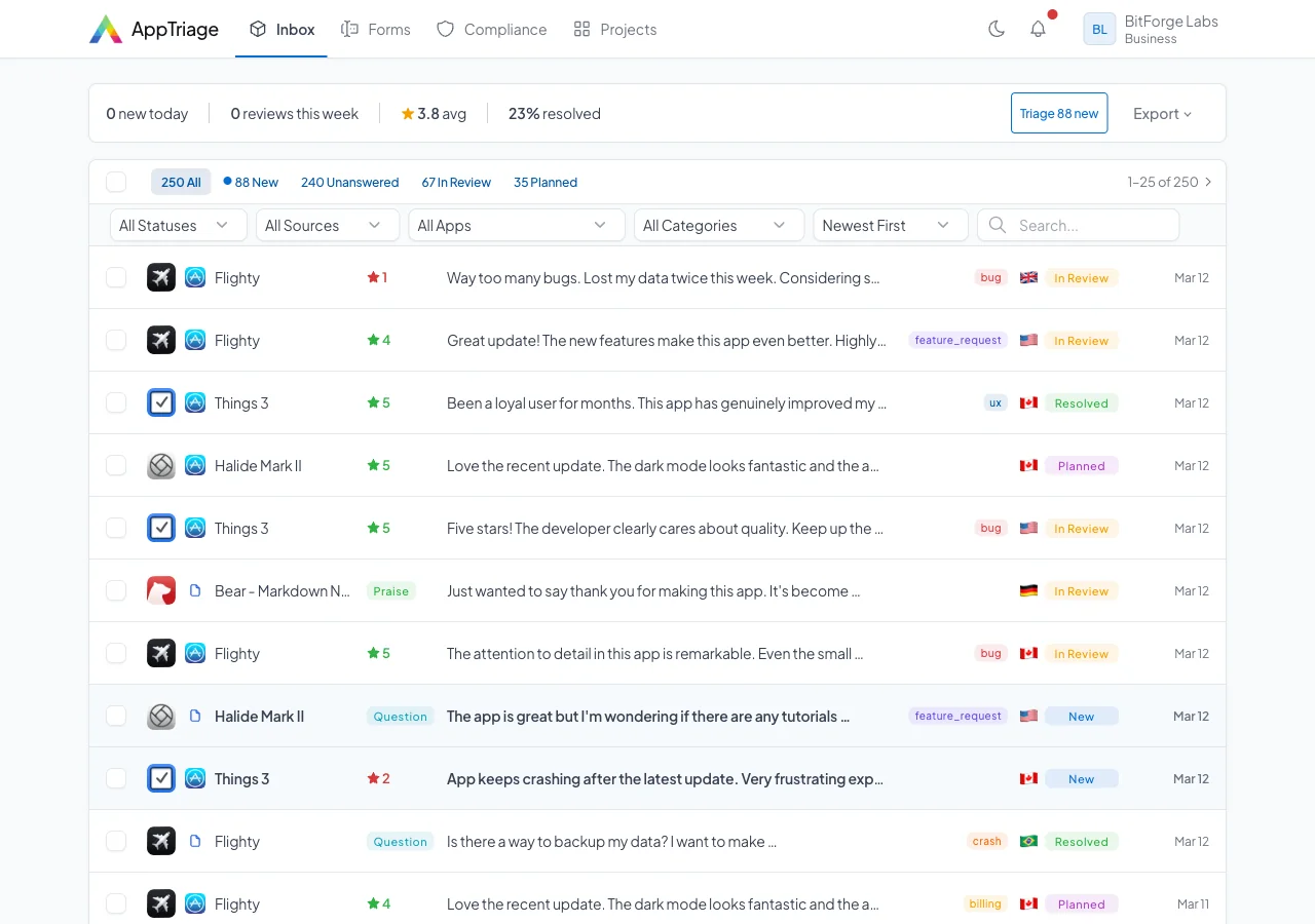 I had three apps, reviews scattered across App Store Connect and email, bug reports in a spreadsheet, and feature requests in Notion. The existing tools were either too expensive or built for enterprise teams. So I built the inbox I wished existed.